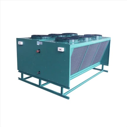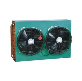 El tipo más utilizado a nivel mundial. Uno o más ventiladores impulsan el aire ambiente a través de serpentines con aletas. No se necesita infraestructura hídrica , simplificando la instalación y reduciendo los costes de mantenimiento. La serie de condensadores enfriados por aire de Brozercool utiliza serpentines de aletas de aluminio con tubos de cobre de alta eficiencia con motores de ventilador EC, logrando tasas específicas de rechazo de calor superiores a 1,8 kW/m².